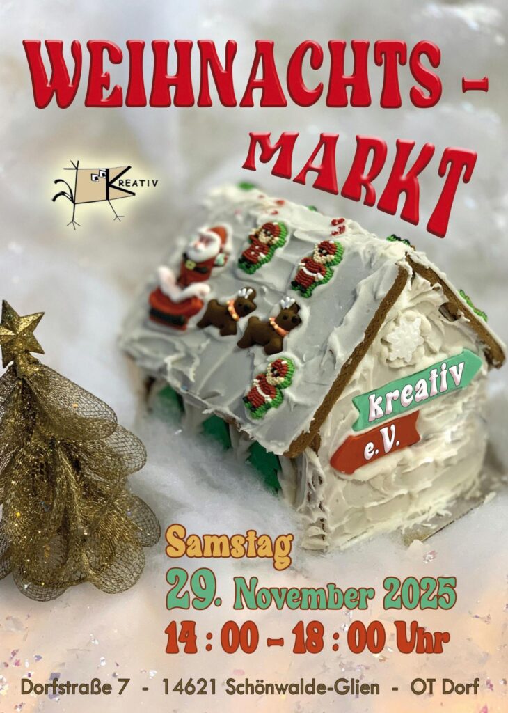 Der Verein kreativ veranstaltet auch in diesem Jahr wieder einen Weihnachtsmarkt am 29.11.2025 von 14.00 bis 18.00 Uhr in der Dorfstraße 7, 14621 Schönwalde-Dorf, OT Dorf in der Scheune und im Innenhof.