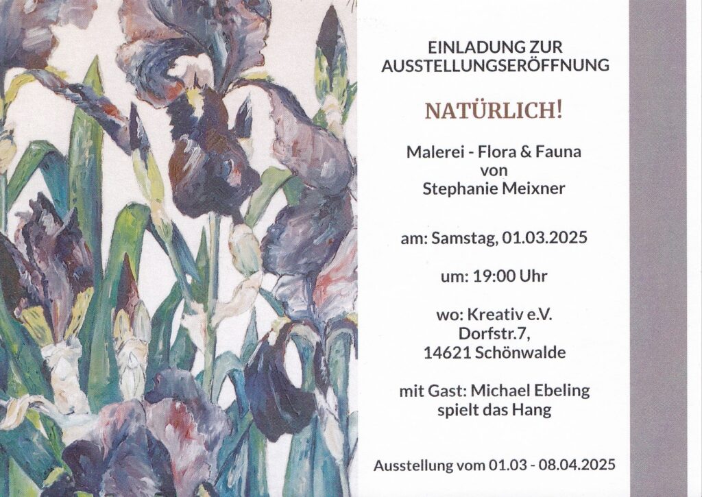 Wir freuen uns, die Ausstellung von Stephanie Meixner ankündigen zu dürfen! Die Vernissage fand am 1. März 2025 in den Galerieräumen von Kreativ e.V., Dorfstraße 7, Schönwalde-Glien statt.