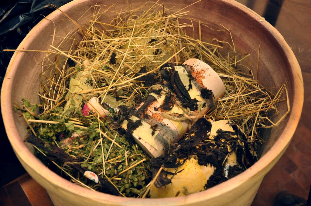 Dafür werden geschrühte Objekten mit Materialen belegt (eingepackt). Das können Naturmaterialen wie getrocknete Farne, Moose, Bananenschalen, Orangenschalen, Nussschalen … aber auch metallische Materialien wie Eisenwolle, Kupferdrähte, Salze oder / und Oxide sein.